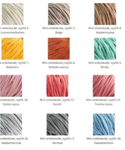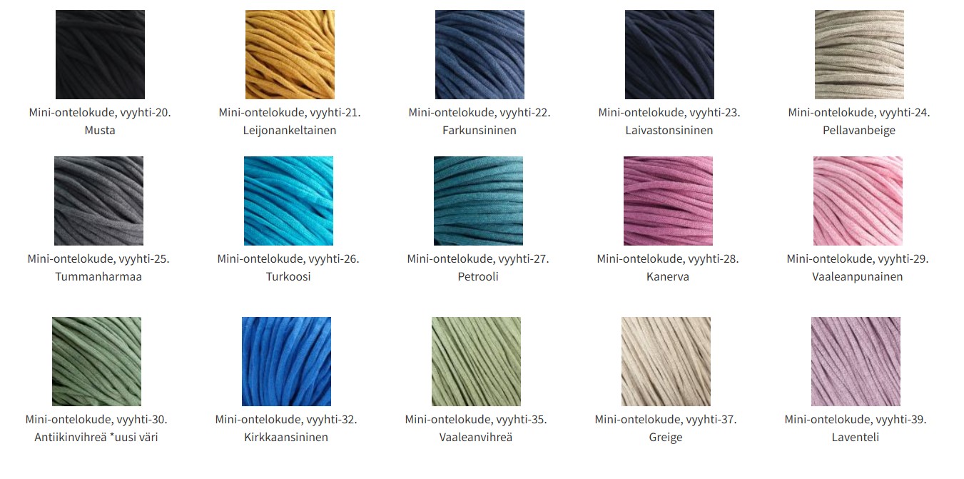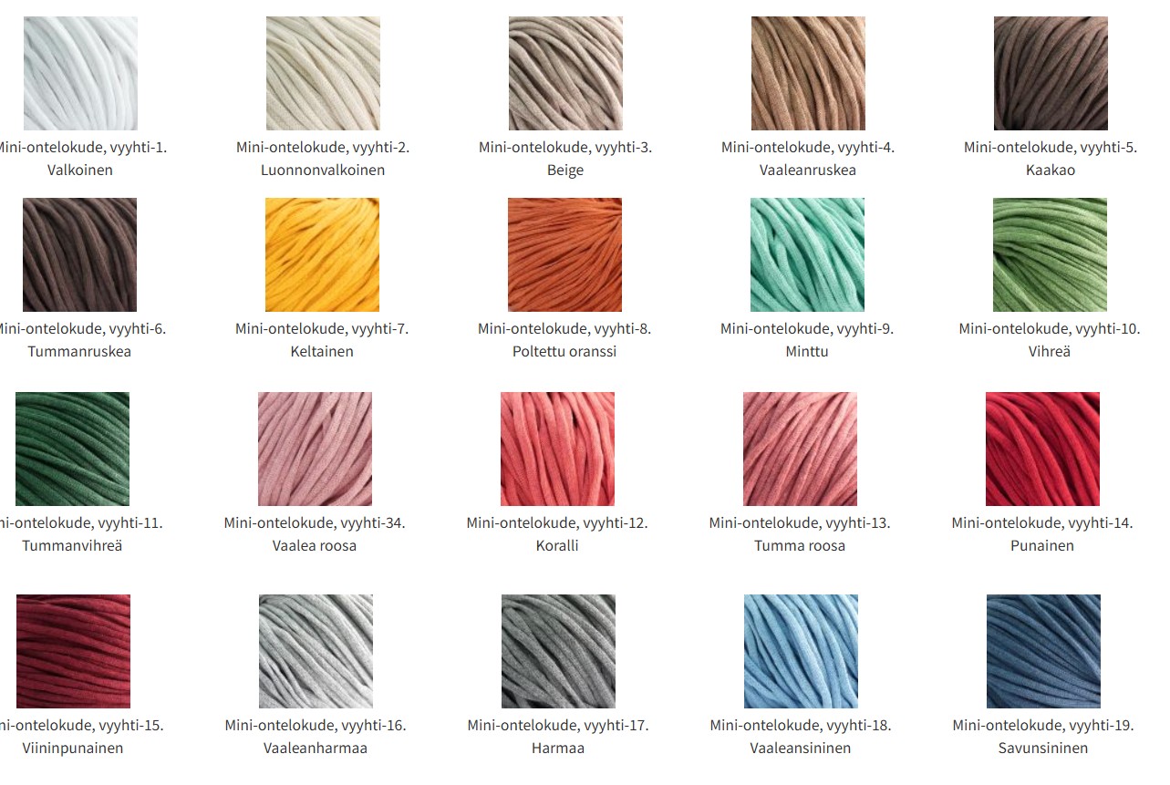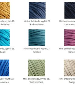 Huomioitavaa: Ontelokuteille suositellaan pesua väljässä 30°C vedessä laimealla pesuliuoksella. Huolellinen huuhtelu ja kuivaus ilmavalla alustalla. Ontelokuteet kutistuvat ensimmäisessä pesussa n. 10-15 %. Kuteet voidaan kutistaa jo ennen käyttöä pesemällä ne pesukoneessa 30°C ohjelmalla. Kuteet tulee lingota hyvin, mahdollisimman kuiviksi. Suosittelemme kutistamaan ontelokuteet etukäteen varsinkin, jos kudotaan kangaspuissa ja kuteita yhdistellään muiden materiaalien kanssa. Kutistaminen ei ole tarpeellista virkattuja tuotteita varten. Ontelokuteiden värikartta on suntaa-antava. Raaka-ainepohjasta riippuen värisävyissä saattaa esiintyä pieniä eräkohtaisia eroja.