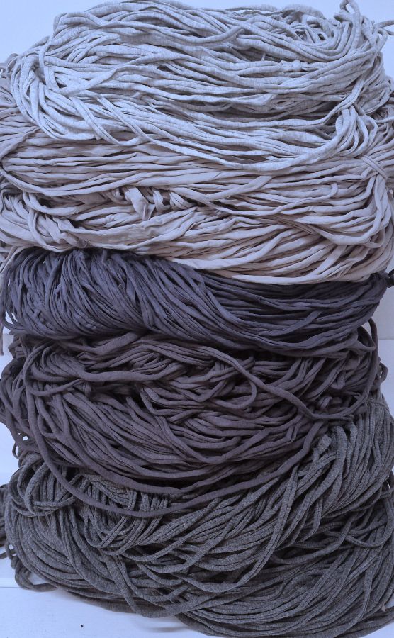 Erilaista harmaata trikookudetta valmiiksi vyyhdittynä. Materiaali on 100% puuvilla, ei sisällä venyvää lycraa eikä tärkkiä. Koukkusuositus 8mm-9mm. Säkin paino 9.84kg.