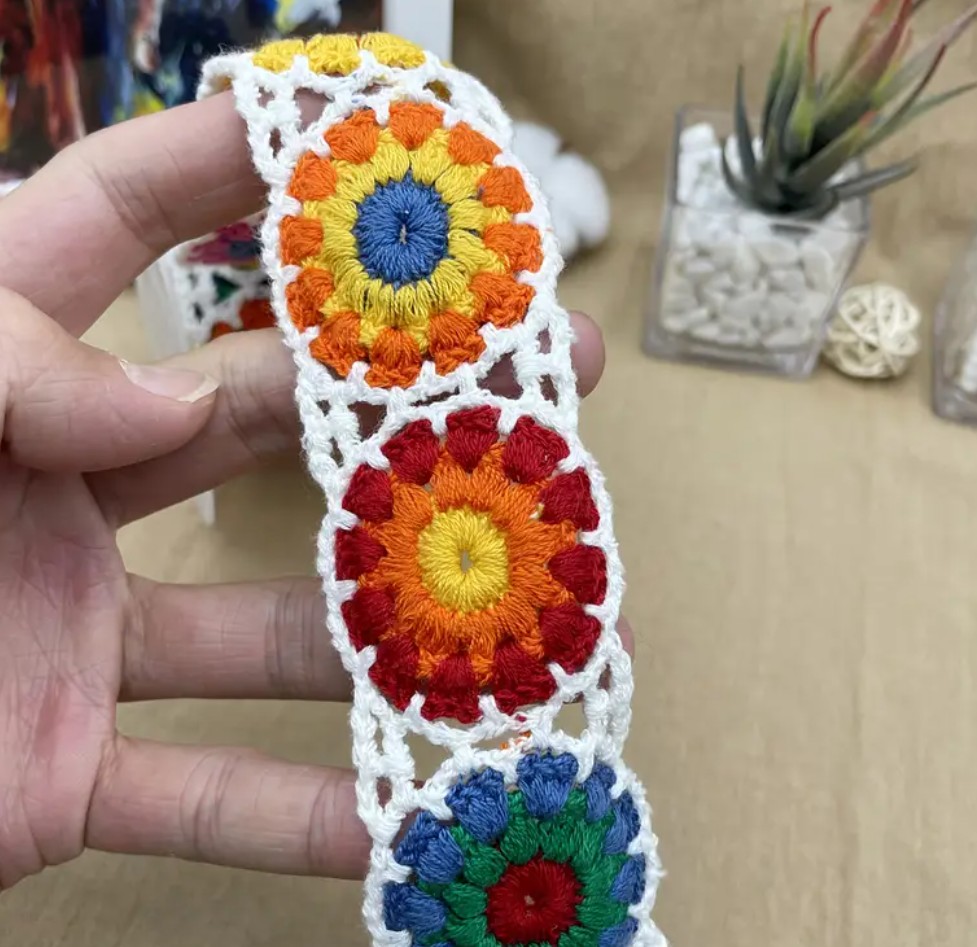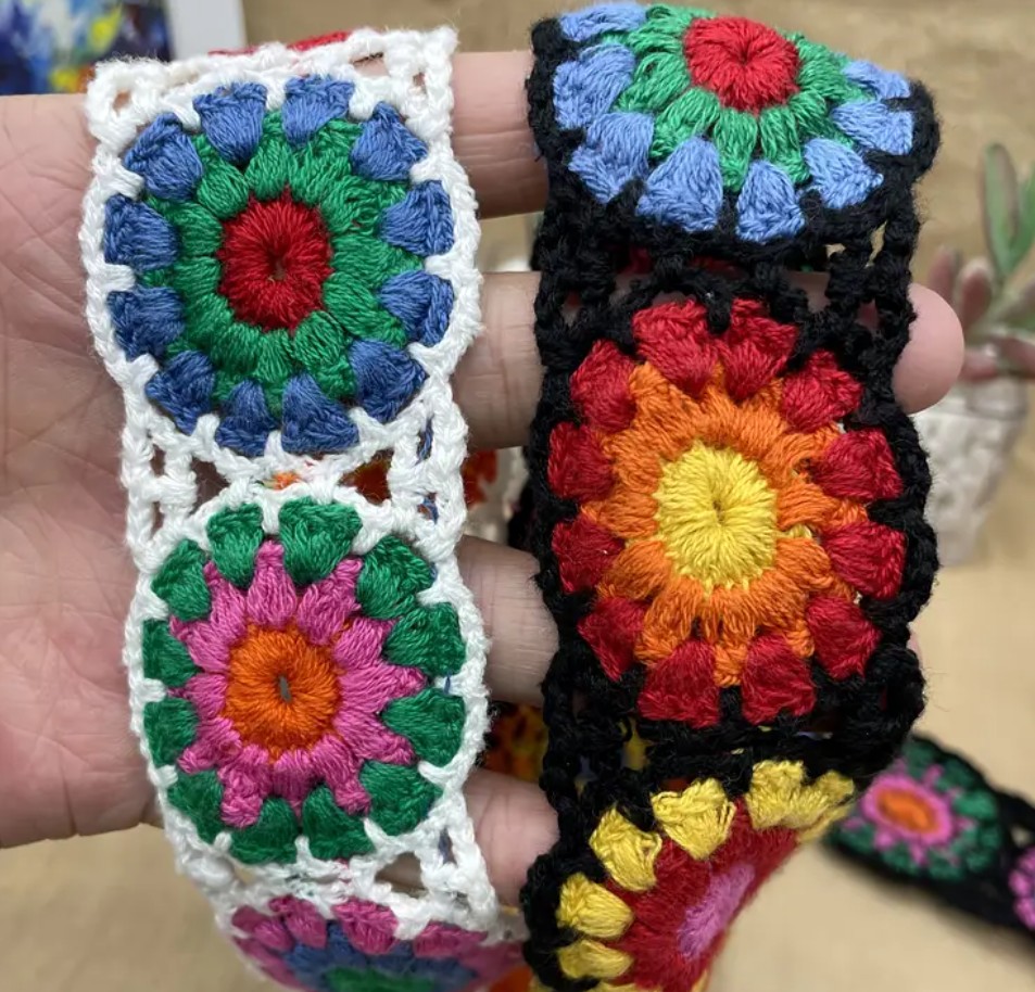 Valmiiksi virkattuja Isoäidin Neliöitä 1.8 metriä pitkässä nauhassa. Nauhan leveys n.4cm. Kivaa pehmoista nauhaa käsityöprojekteihin, vaatteisiin, laukkuihin yms. Materiaali 100% puuvillasekoite. Väreinä musta- tai valkopohjainen nauha.