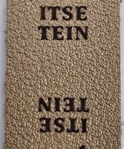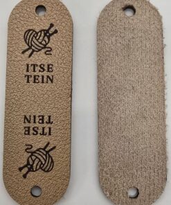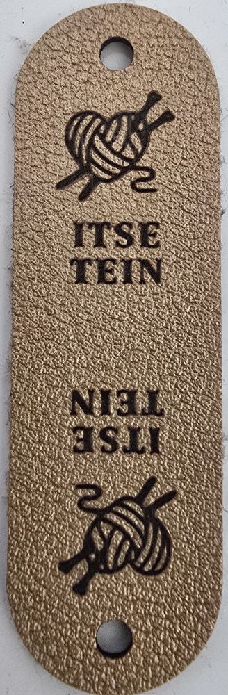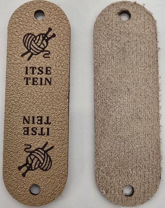 ITSE TEIN- merkki laadukasta PU-nahkajäljitelmä. Merkin koko 2cm x 5cm ja vahvuus n.2mm. Jokaisessa merkissä on kaksi esiporattua reikää, joiden avulla ompelu on nopeaa ja helppoa. Merkin mukana tulee metallinen niitti jolla kiinnitys varmasti pysyy paikallaan mikäli et halua ommella merkkiä.