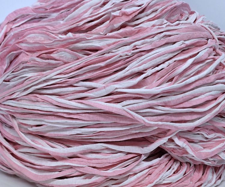 Vaaleanpunaisen-valkoisen kirjavaa trikookudetta valmiiksi vyyhdittynä. Kuteessa ei ole tärkkiä eikä venyvää lycraa. Materiaali 100% puuvilla. Koukkusuositus 6mm-7mm. Säkin paino 3.59kg.