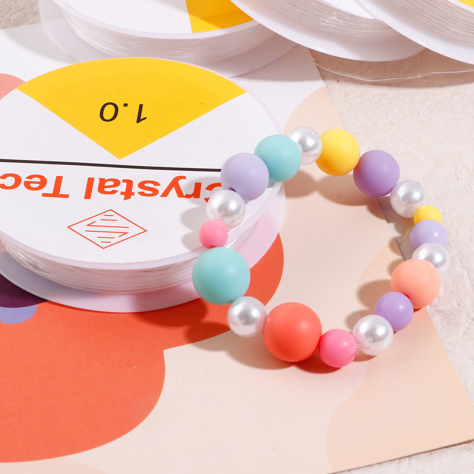 Läpinäkyvä kestävä ja venyvä lanka koruihin tms. askarteluun. Vahvuus 0.8mm ja kiekossa n.6 metriä lankaa. Saman tapainen lanka kuin siima mutta venyvä.25