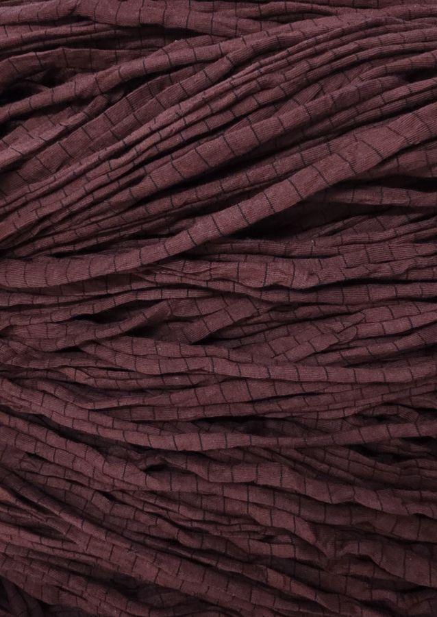 Luumun väristä (musta ohut poikkiraita) trikookudetta valmiiksi vyyhdittynä. Materiaali on 100% puuvillaa eikä se sisällä tärkkiä eikä venyvää lycraa. Koukkusuositus 7mm-8mm. Säkin paino 2.46kg.