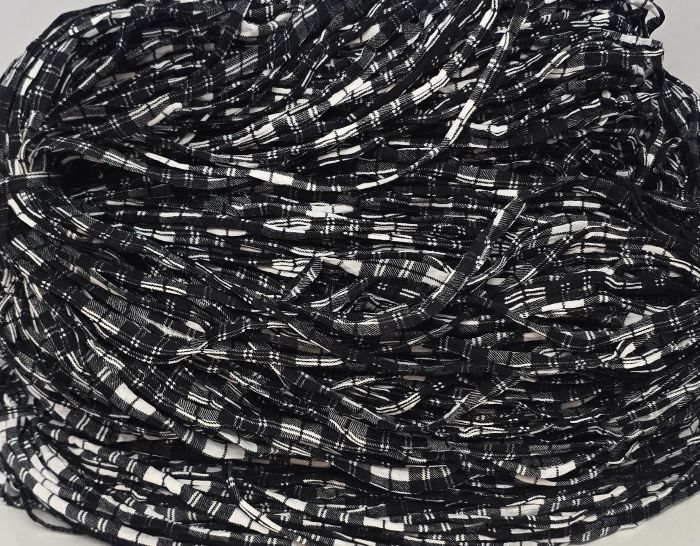 Kirjavaa mustavalkoista trikookudetta valmiiksi vyyhdittynä. Materiaali on 100% puuvillaa eikä se sisällä tärkkiä eikä venyvää lycraa. Koukkusuositus 7mm-8mm. Säkin paino 3.87kg.