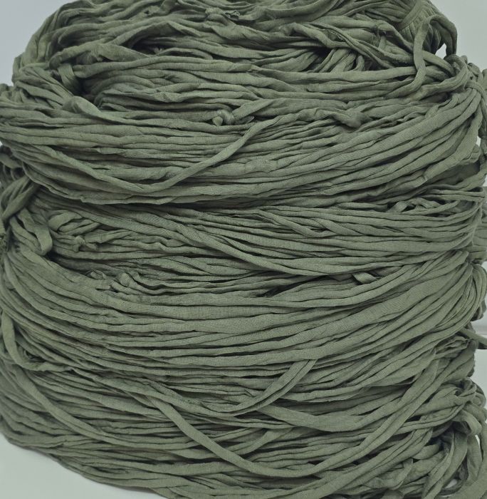 Oliivinvihreää trikookudetta valmiiksi vyyhdittynä. Materiaali on 100% puuvilla, ei sisällä venyvää lycraa eikä tärkkiä. Koukkusuositus 7mm-8mm. Säkin paino 5.25kg.