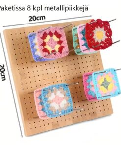 Kätevä puinen pingotinpohja vaikkapa Isoäidin neliöitä virkatessa. Pohjalaudan koko 20cm x 20cm ja mukaan tulee 8 kappaletta nauloja.
