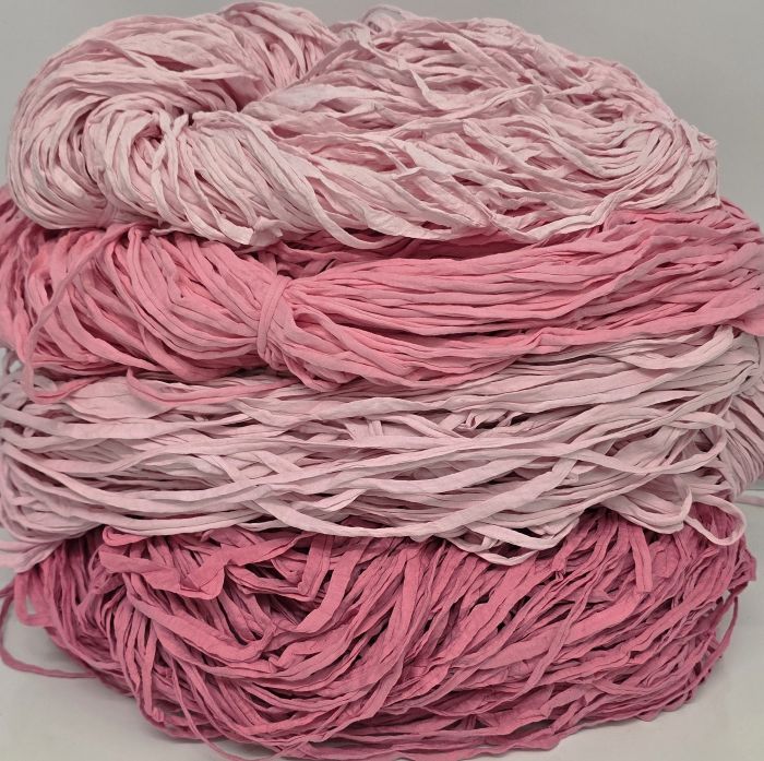 Lajitelma pinkkiä ja vaaleanpunaista trikookudetta valmiiksi vyyhdittynä. Materiaali on 100% puuvilla, ei sisällä venyvää lycraa eikä tärkkiä. Koukkusuositus 6mm-7mm. Säkin paino 5.1kg.
