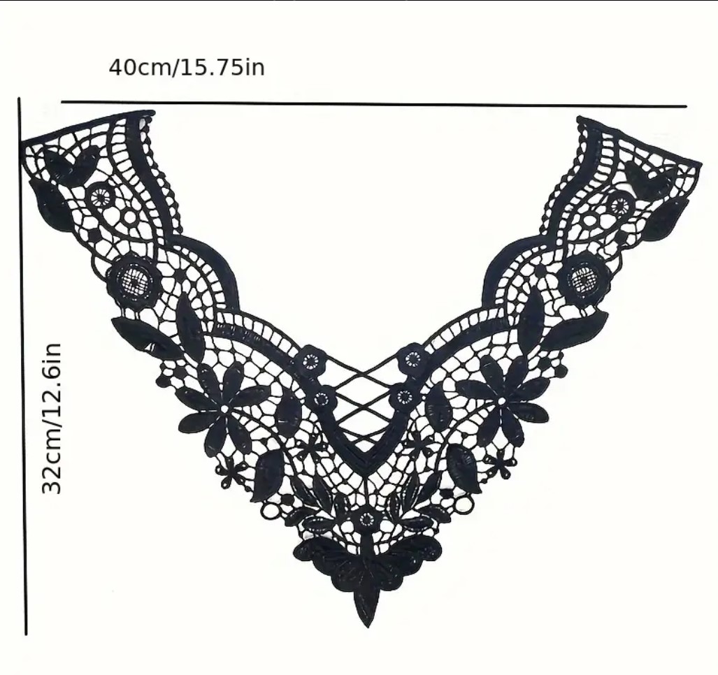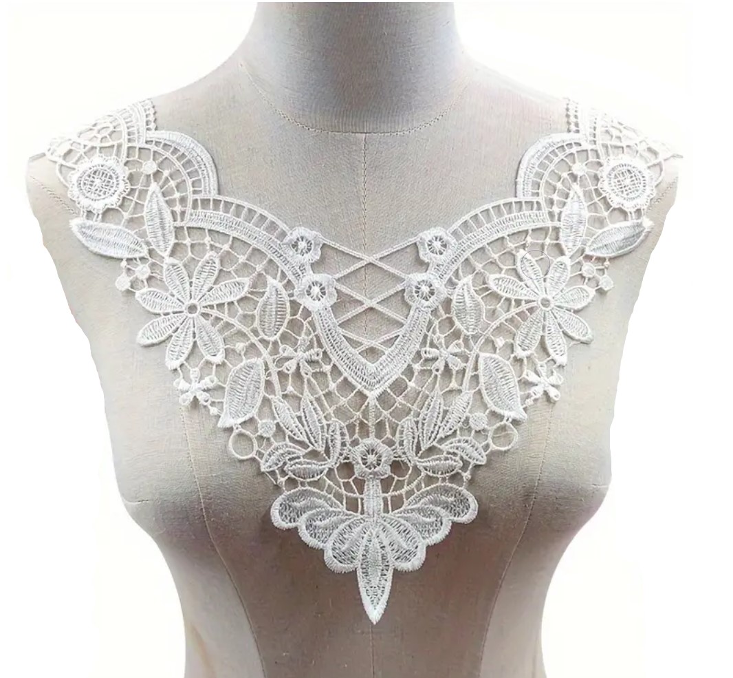 Upea brodeerattu valkoinen kaulus jonka voit kiinnittää vaikkapa puseroon tai paitaan ompelemalla. Tämä on näyttävä tehoste piristämään mitä tahansa vaatekappaletta. Kauluksen pituus 40cm ja leveys 32cm. Materiaali 100% polyester, kestää 60 asteen vesipesun.