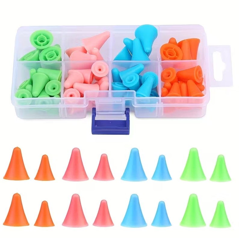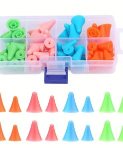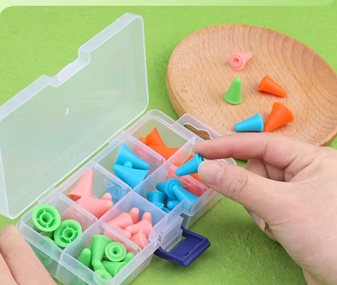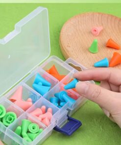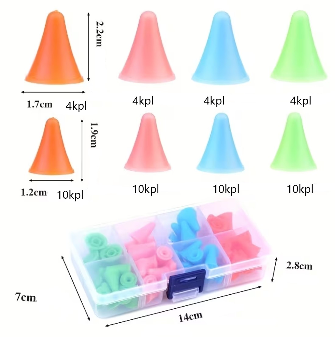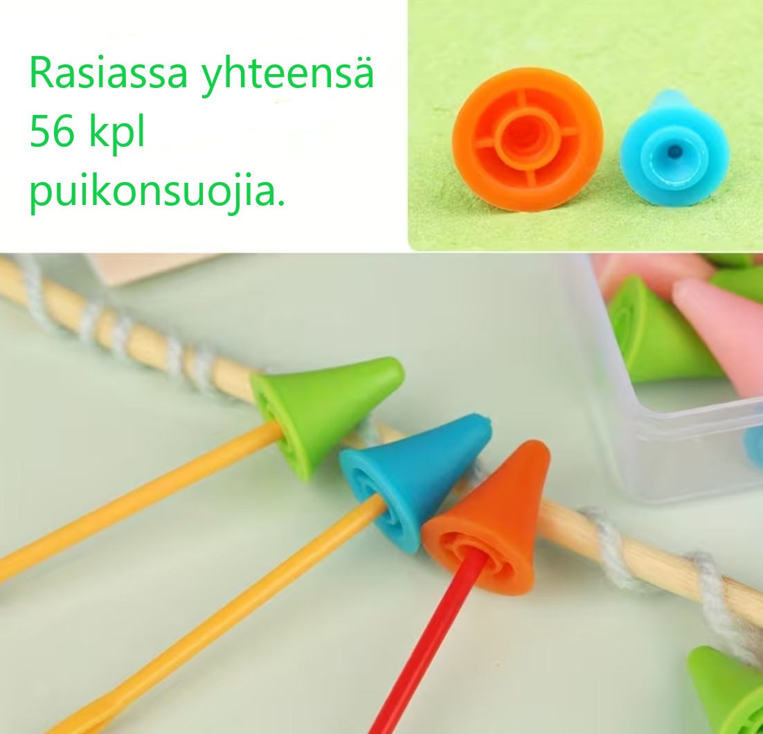 Silikoniset puikonsuojat kätevässä muovirasiassa. Nämä estävät silmukoiden karkaamisen silloin kun työ on huilaamassa. Rasia sisältää 16 kappaletta isompia puikonsuojia sekä 40 kappaletta pienempiä puikonsuojia. Materiaali on silikoni joten tarvittaessa voit pestä suojat astianpesuaineella.