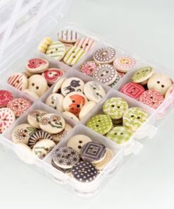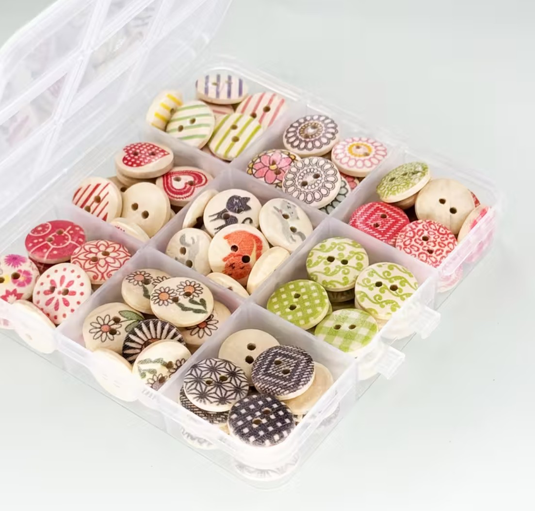 Tästä riittää nappeja joka lähtöön, rasiassa 108 kpl puupohjaisia, kuvan mukaisia nappeja. Yhden napin halkaisija 15mm. Kätevä rasia pitää napit järjestyksessä.