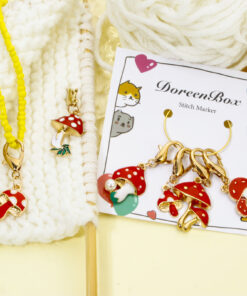 Metalliset emaloidut hauskat sieniaiheiset silmukkamerkit. Voidaan käyttää myös esim. laukussa, kukkarossa, vetoketjussa yms. Materiaali lyijytön ja nikkelitön metalliseos. Merkkien koko 2cm x 4.6cm – 1.1cm x 3.6cm.