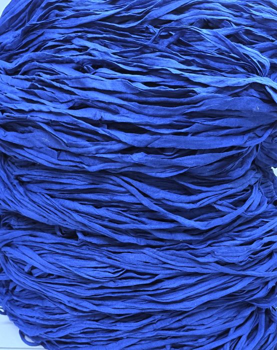 Suomenlipun sinisen väristä trikookudetta valmiiksi vyyhdittynä. Materiaali on 100% puuvillaa eikä se sisällä venyvää lycraa eikä tärkkiä. Koukkusuositus 7mm-8mm. Säkin paino 6.53kg