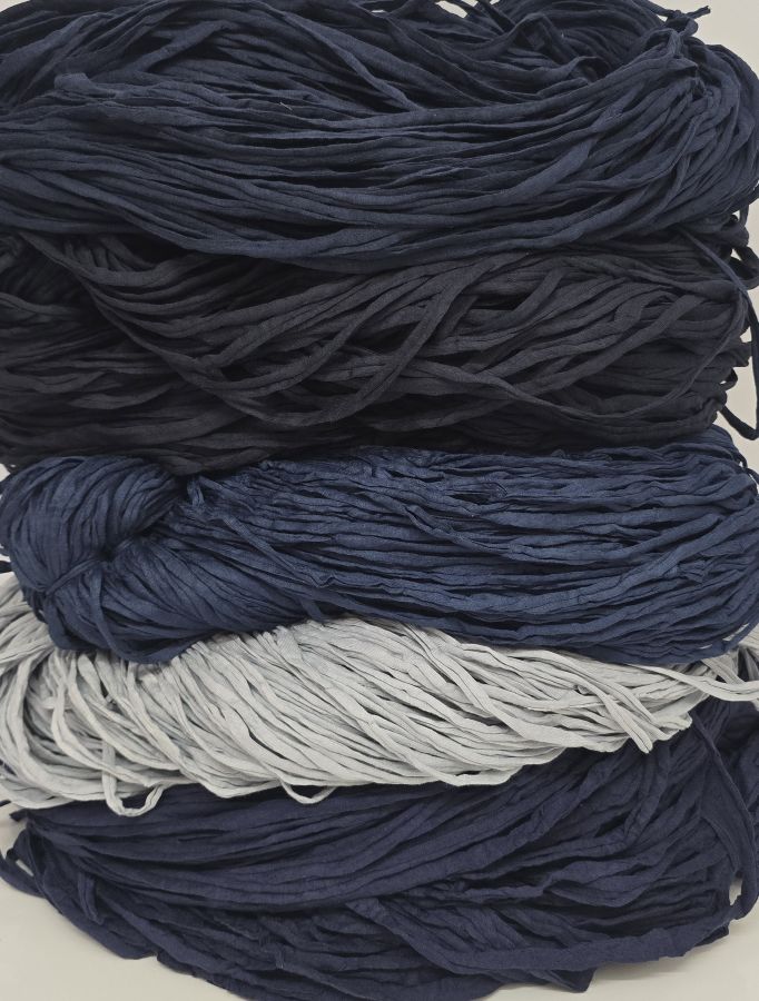 Erilaisia sinisen sävyisiä trikookuteita valmiiksi vyyhdittynä. Materiaali on 100% puuvilla, ei sisällä venyvää lycraa eikä tärkkiä. Koukkusuositus 7mm-8mm. Säkin paino 7.3kg.