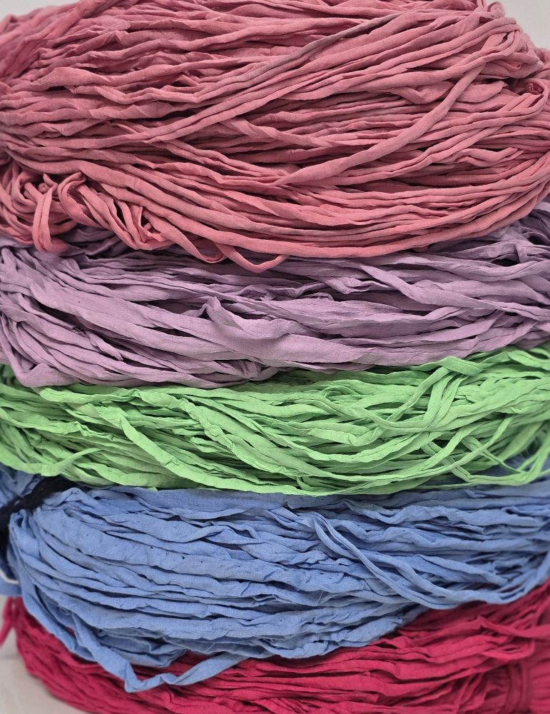 Kuvan mukaisia trikookuteita valmiiksi vyyhdittynä. Materiaali on 100% puuvillaa eikä se sisällä tärkkiä eikä venyvää lycraa. Koukkusuositus 6mm-9mm. Säkin paino 10.55kg.