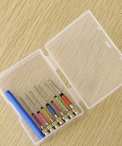 Kätevässä rasiassa tuftaus/aplikointikynä ja neuloja 7 kpl. Varsi on teräksinen ja kestävä, neulat ruuvataan kynän varteen. Neulojen pituudet 4.5cm, 4.6cm ja 4.7cm. Neulojen vahvuudet: 0.9mm, 1.2mm, 1.4mm, 1.8mm ja 2mm.