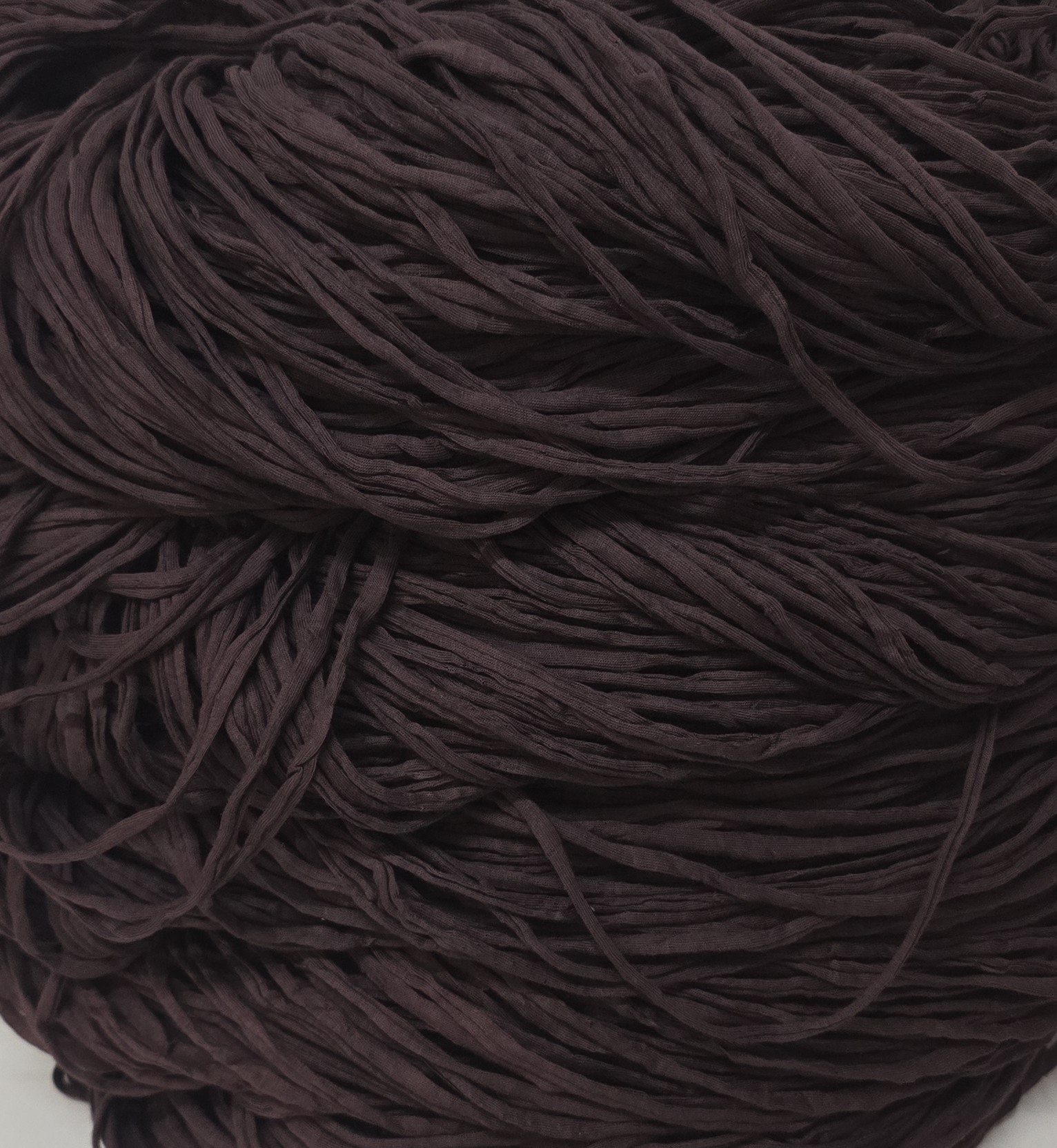 Tummaa munakoison väristä trikookudetta valmiiksi vyyhdittynä. Kuteessa ei ole tärkkiä eikä venyvää lycraa. Materiaali 100% puuvilla. Koukkusuositus 6mm-7mm. Säkin paino 2.35kg.