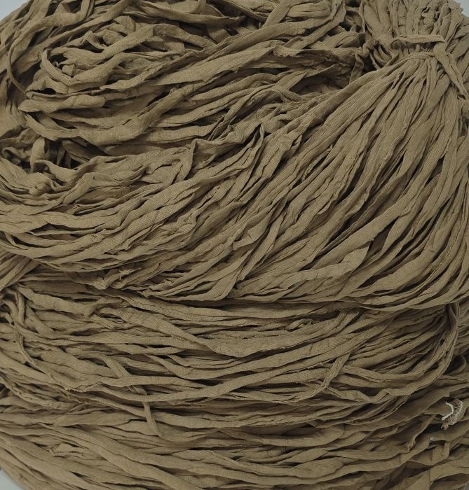 Tumman dijon sinapin väristä trikookudetta valmiiksi vyyhdittynä. Materiaali on 100% puuvillaa eikä se sisällä tärkkiä eikä venyvää lycraa. Koukkusuositus 7mm-8mm.