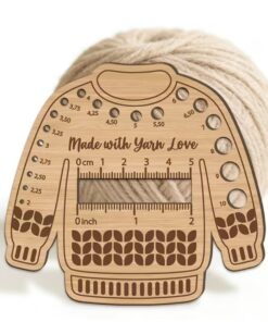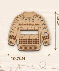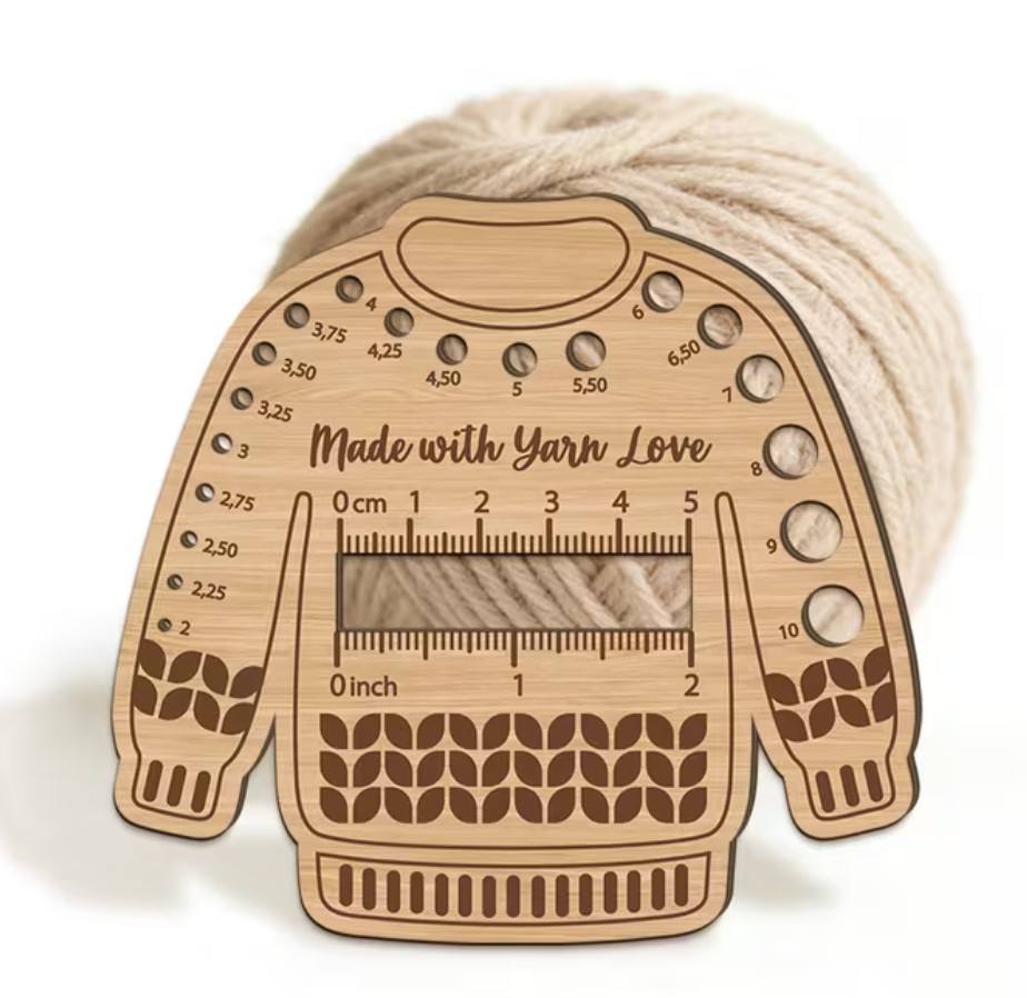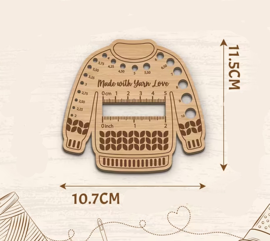 Söpö puikkomitta vaneria, mitan koko 10.7cm x 11.5cm. Kätevä mittausväline neulontaan, virkkaukseen ja ompeluun.