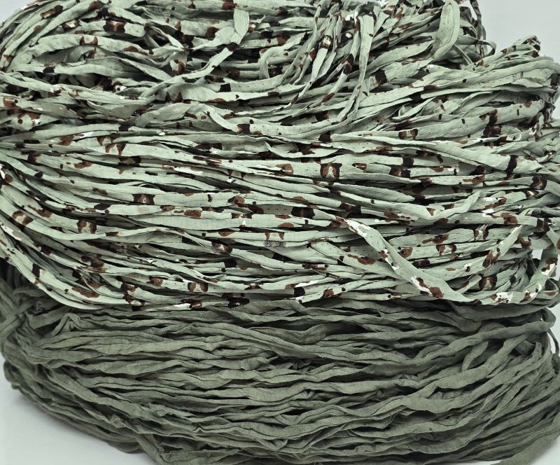 Oliivinvihreää ja vihreänkirjavaa trikookudetta valmiiksi vyyhdittynä. Materiaali on 100% puuvillaa eikä se sisällä tärkkiä eikä venyvää lycraa. Koukkusuositus 7mm-8mm. Säkin paino 4.1kg.